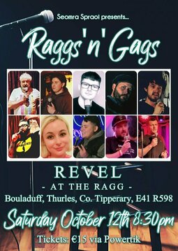 Hi All. A comedy night filled with rising stars is coming to the Revel At The Ragg. This acclaimed bar will be a larger than life event as we plan to give a rural Tipperary a night filled with various styles of comedy, stories and just plain old craic. We're already looking forward to brining our show to you.