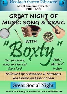 Great night of music song & Craic with Boxty. Clap your hands, stamp your feet and sing a long. Afterwards enjoy Colcannon & Sausages tea, coffee and lots of chat. Great Social Night.