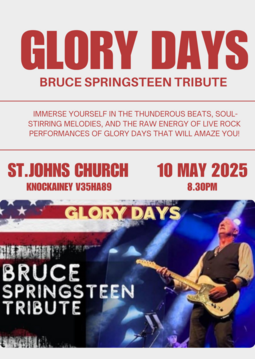 Get ready for an unforgettable night as Glory Days, Ireland’s premier Bruce Springsteen tribute band are coming to Knockainey St.John's Church, Knockainey, Co. Limerick V35HA89 on May 10th, 2025. For over 5 years, Glory Days has thrilled audiences in theatres, festivals, and large venues across Ireland, capturing the raw energy, passion, and soul of Bruce Springsteen and the legendary E Street Band.