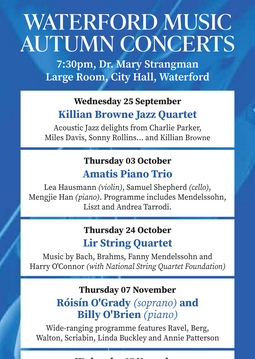 You can buy a season ticket for all of our autumn concerts here, except for our joint Irish Chamber Orchestra Concert with the Symphony Club of Waterford. This is our Five for €75 offer, and it gives you entry to the following five concerts.