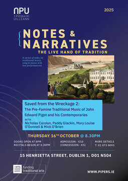Notes & Narratives will take place at Na Píobairí Uilleann, 15 Henrietta Street, Dublin 1, starting at 8:30pm on Thursday 16th October 2025.