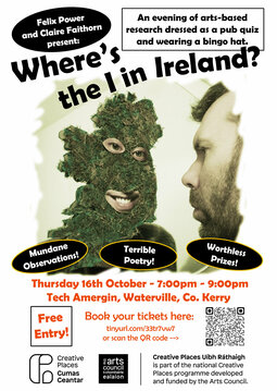 Where’s the “I” in Ireland? is a quirky mixture of a pub quiz, very serious lecture and scientific survey turned on its head. It explores ideas about identity and place as well as what it feels like to be (or become) Irish in unexpected and creative ways. Host Felix Power is joined by facilitator and Úibh Ráthaigh resident Claire Faithorn to guide the audience through a series of thought-provoking questions that only YOU know the answers to.