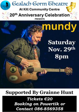As part of our 20th anniversary celebrations in The Gealach Gorm Theatre we are delighted to welcome Mundy to perform on Saturday November 29th . Mundy has played in our theatre to packed houses in the past and is thrilled to part of our 20th anniversary celebrations. Supported by Grainne Hunt who enchants audiences with her heart-melting vocals and emotional songs, making her a standout among Ireland's vocalists and songwriters.
